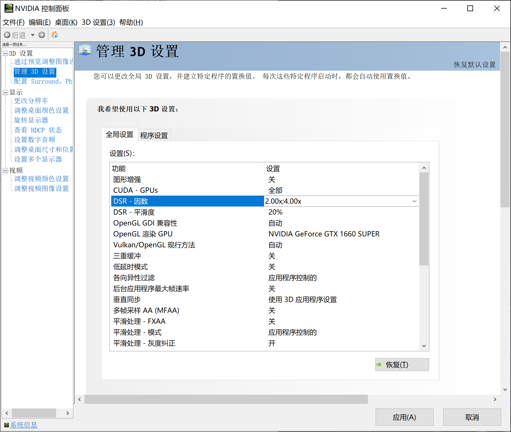 在左侧选择“管理3D设置”,在右侧DSR-因数选择合适的档位,我推荐选择整数倍数的分辨率,比如1080P的两倍是4K。DSR-平滑因数,我推荐20%,更高文字会更模糊,更低会支离破碎。最后应用即可。